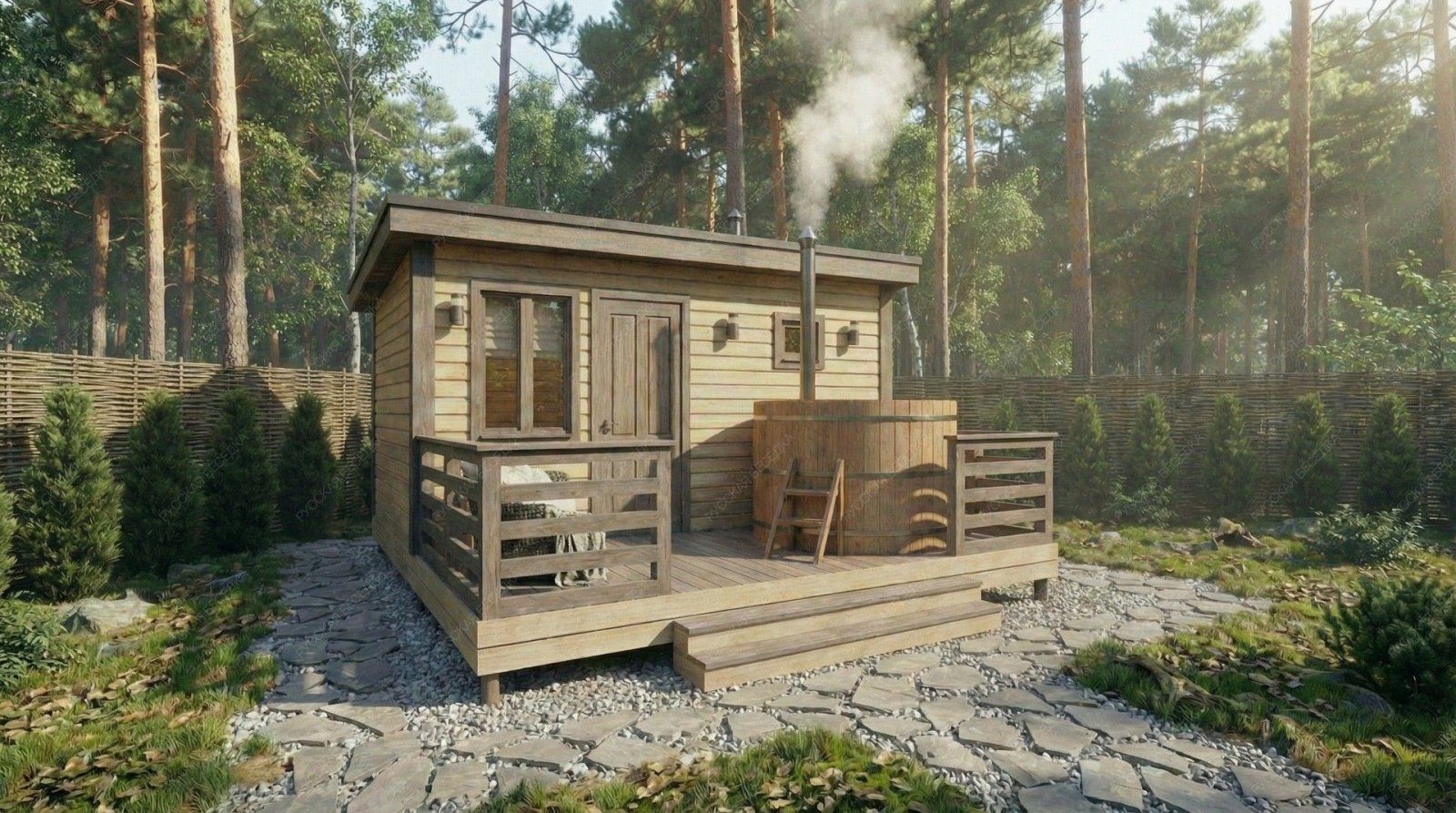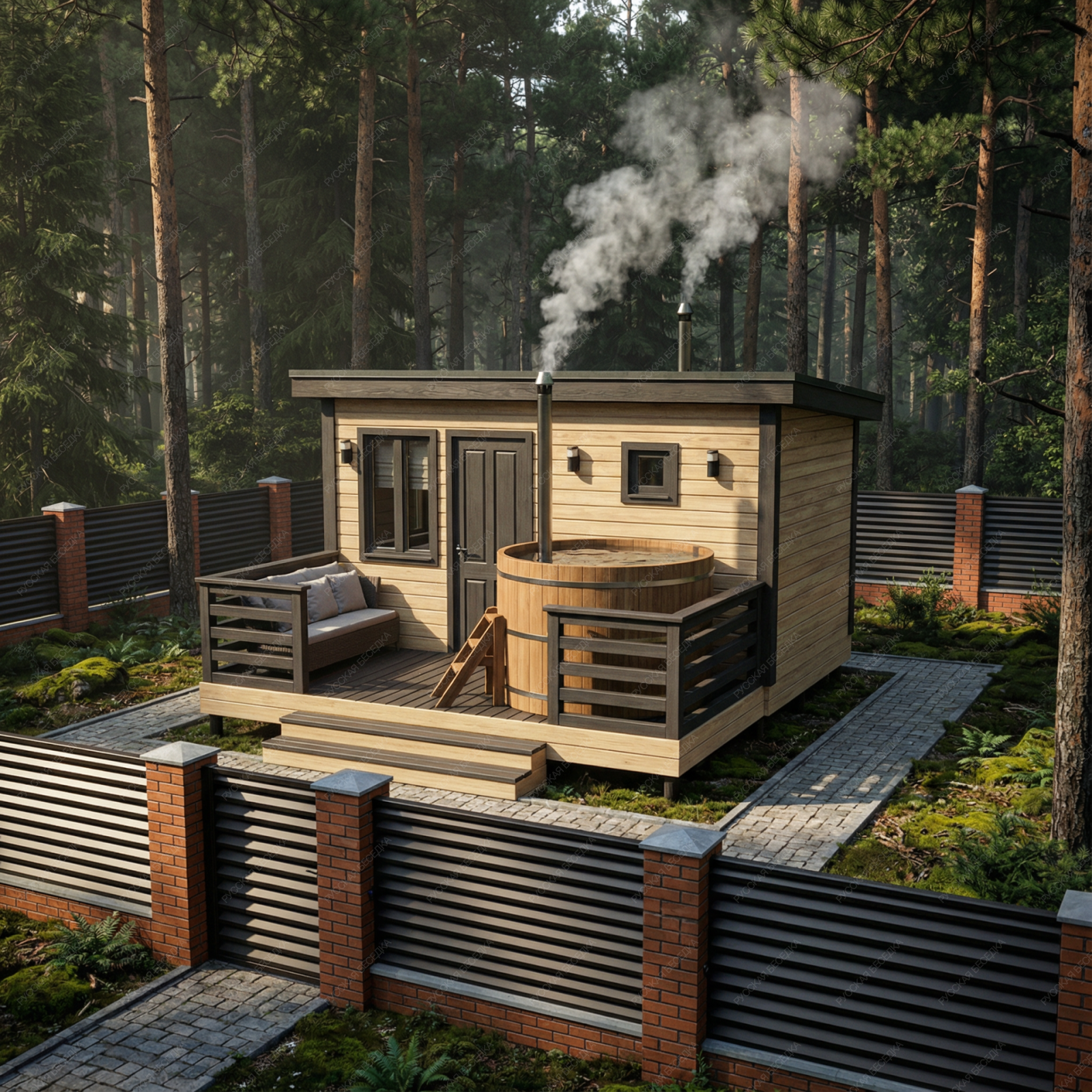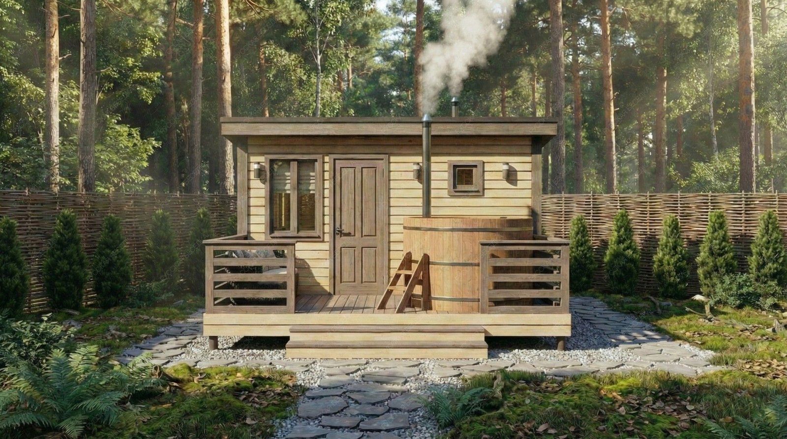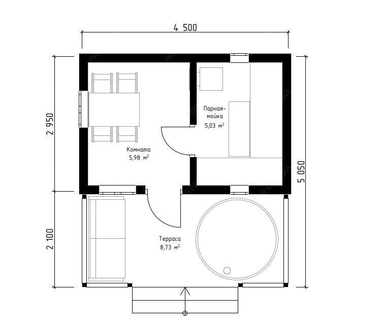 Баня «Аркадия» представляет собой компактное и продуманное до мелочей решение для ценителей традиционных банных ритуалов с элементами современного комфорта. Модель с открытой террасой эффективно использует пространство, создавая многофункциональную зону для отдыха и релаксации на свежем воздухе площадью 8,73 м².  Внутренняя планировка отличается рациональностью: объединенная парная-мойка (5,03 м²) с деревянным окном-форточкой обеспечивает правильный пар и удобство проведения процедур. Уютная комната отдыха (5,98 м²) становится теплым и гостеприимным местом для чаепития и общения после пара. Односкатная крыша и общие габариты (2,95х4,5 м + терраса 2,1х4,5 м) придают строению современный динамичный силуэт, гармонично вписывающийся в ландшафт.  Этот проект идеально подходит для участков, где важна оптимизация площади без ущерба для функциональности и атмосферы. Качество материалов и строительства гарантирует энергоэффективность, долговечность и создание той особой целебной среды, ради которой и строится настоящая русская баня.