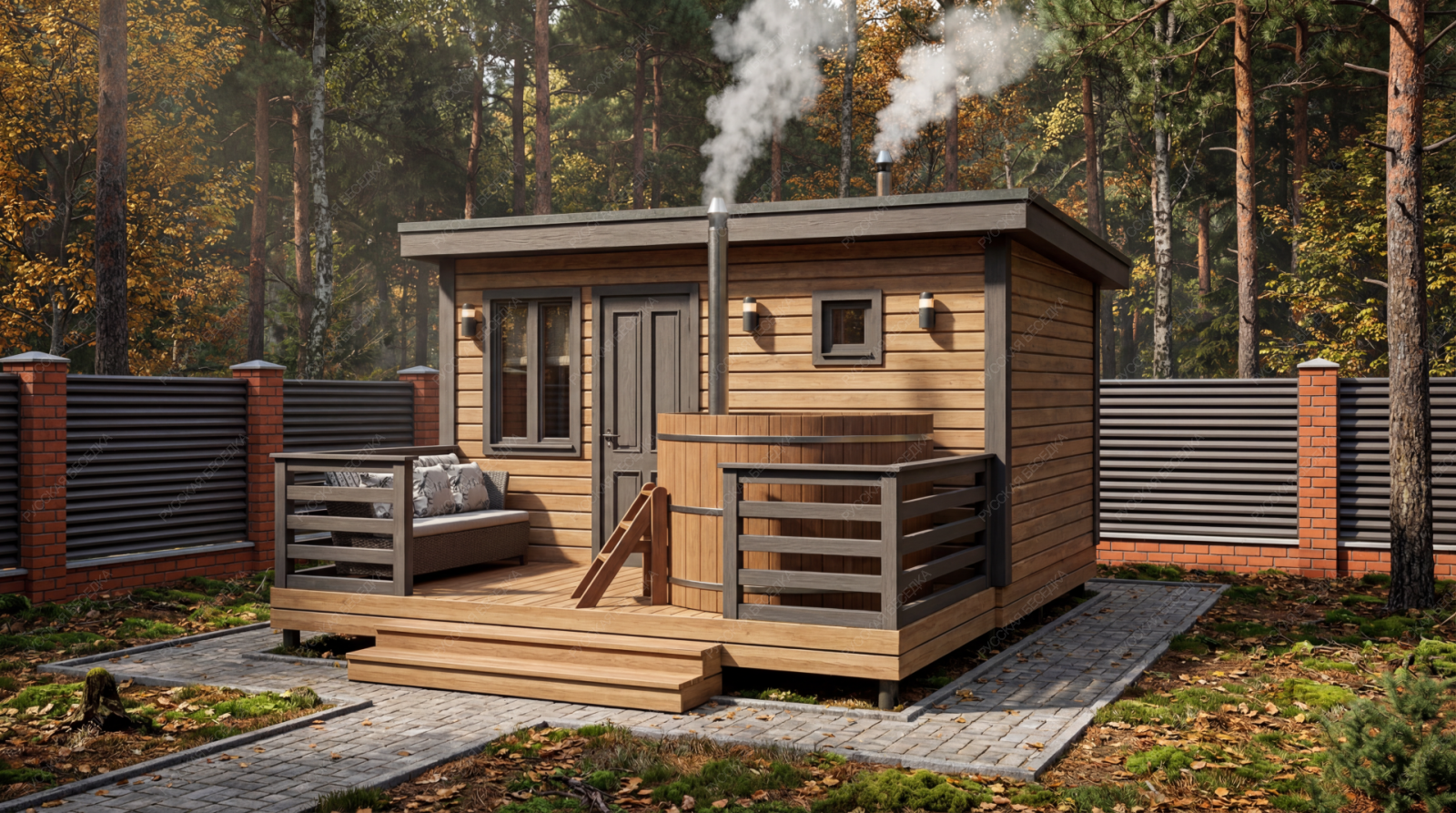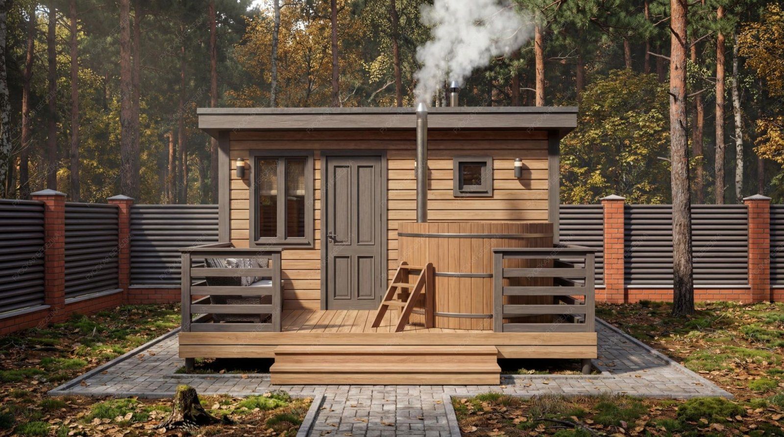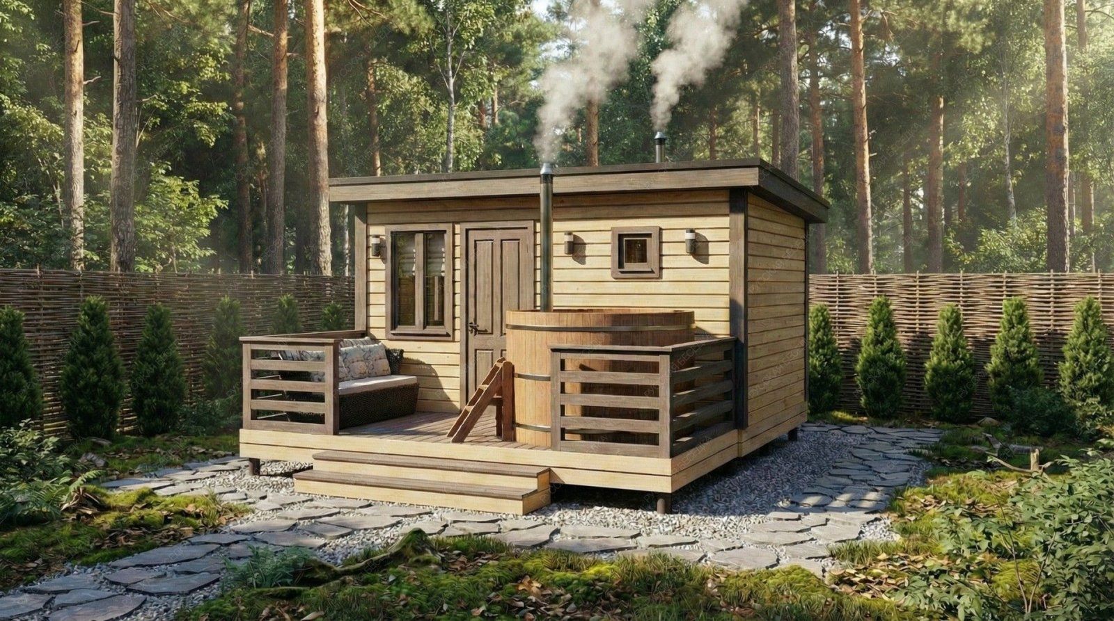 Баня «Аркадия» представляет собой компактное и продуманное до мелочей решение для ценителей традиционных банных ритуалов с элементами современного комфорта. Модель с открытой террасой эффективно использует пространство, создавая многофункциональную зону для отдыха и релаксации на свежем воздухе площадью 8,73 м².  Внутренняя планировка отличается рациональностью: объединенная парная-мойка (5,03 м²) с деревянным окном-форточкой обеспечивает правильный пар и удобство проведения процедур. Уютная комната отдыха (5,98 м²) становится теплым и гостеприимным местом для чаепития и общения после пара. Односкатная крыша и общие габариты (2,95х4,5 м + терраса 2,1х4,5 м) придают строению современный динамичный силуэт, гармонично вписывающийся в ландшафт.  Этот проект идеально подходит для участков, где важна оптимизация площади без ущерба для функциональности и атмосферы. Качество материалов и строительства гарантирует энергоэффективность, долговечность и создание той особой целебной среды, ради которой и строится настоящая русская баня.
