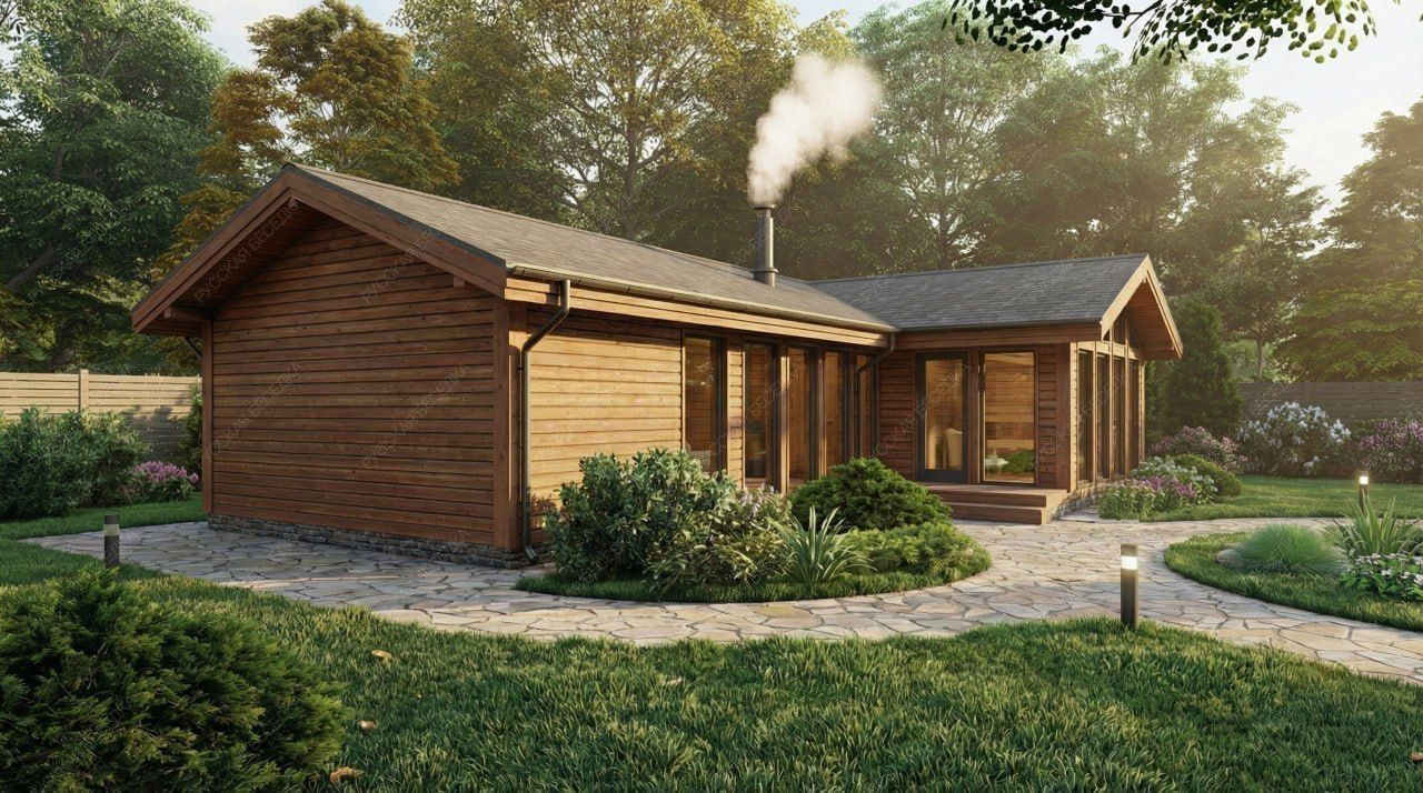 Двухскатная крыша придает строению солидный, завершенный облик и обеспечивает надежную защиту от осадков. Каркасная технология гарантирует высокую скорость возведения, энергоэффективность и долговечность конструкции. Данный проект ориентирован на создание многофункционального комплекса, где традиционные банные процедуры гармонично сочетаются с возможностями для полноценного загородного отдыха и гостеприимства.