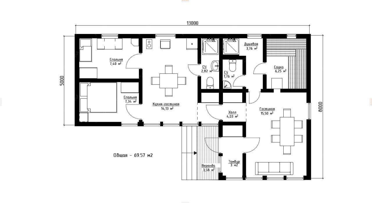 Каркасная баня «Сибирская» с двухскатной крышей представляет собой масштабный проект площадью 69,57 кв.м. при габаритах 13х8 метров, предназначенный для полноценного семейного отдыха и приема гостей. Ключевым архитектурным элементом выступает панорамное остекление в комнате отдыха 15,50 кв.м., создающее эффект визуального единения интерьера с природным окружением и наполняющее пространство естественным светом.