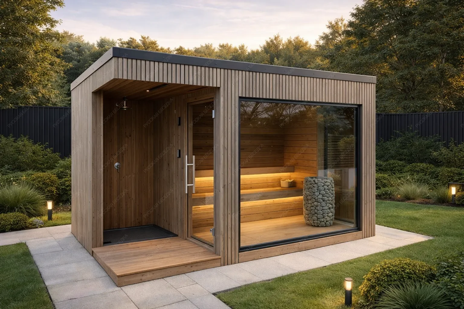 Модульная баня «Яра» с габаритами 4х5 метров представляет собой архитектурную идею для сада, объединяющую под односкатной крышей 20 кв.м. пространства, отведенного исключительно для релаксации. Конструкция состоит из двух ключевых зон: компактной парной и открытой душевой, что формирует суть проекта как лаконичной сауны на природе. Парная идеально адаптирована для установки электропечи, обеспечивающей быстрый и контролируемый нагрев. Большое панорамное окно в сочетании с такой же дверью размывает грань между внутренним помещением и садовым ландшафтом, создавая полное визуальное единение с окружающей зеленью во время процедур. Модульная технология гарантирует оперативный монтаж на подготовленном участке. Данная модель ориентирована на ценителей современного дизайна, технологичной простоты и глубокой связи с природой, предлагая готовое персональное пространство для восстановления сил.