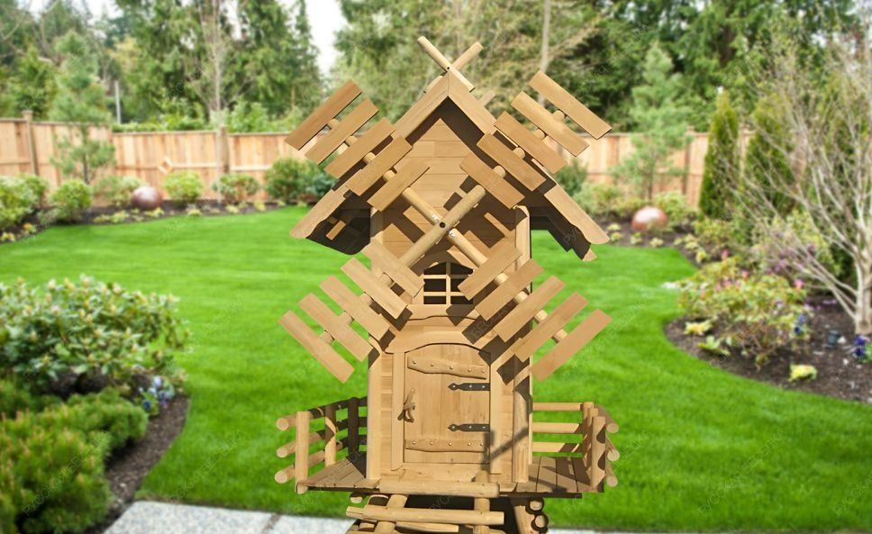 Декоративная мельница из дерева создана для любимого сада, чтобы украсить его и преобразить на радость, а может даже зависть всем окружающим. Наша большая деревянная мельница стоит на площадке, выполненной из березовых бревнышек. Лучшими соседями этого изделия будут красивые многолетники, сочный газон, композиции из камней. Она сделана с человеческий рост и даже выше, значит, ее будет невозможно не заметить даже издалека.