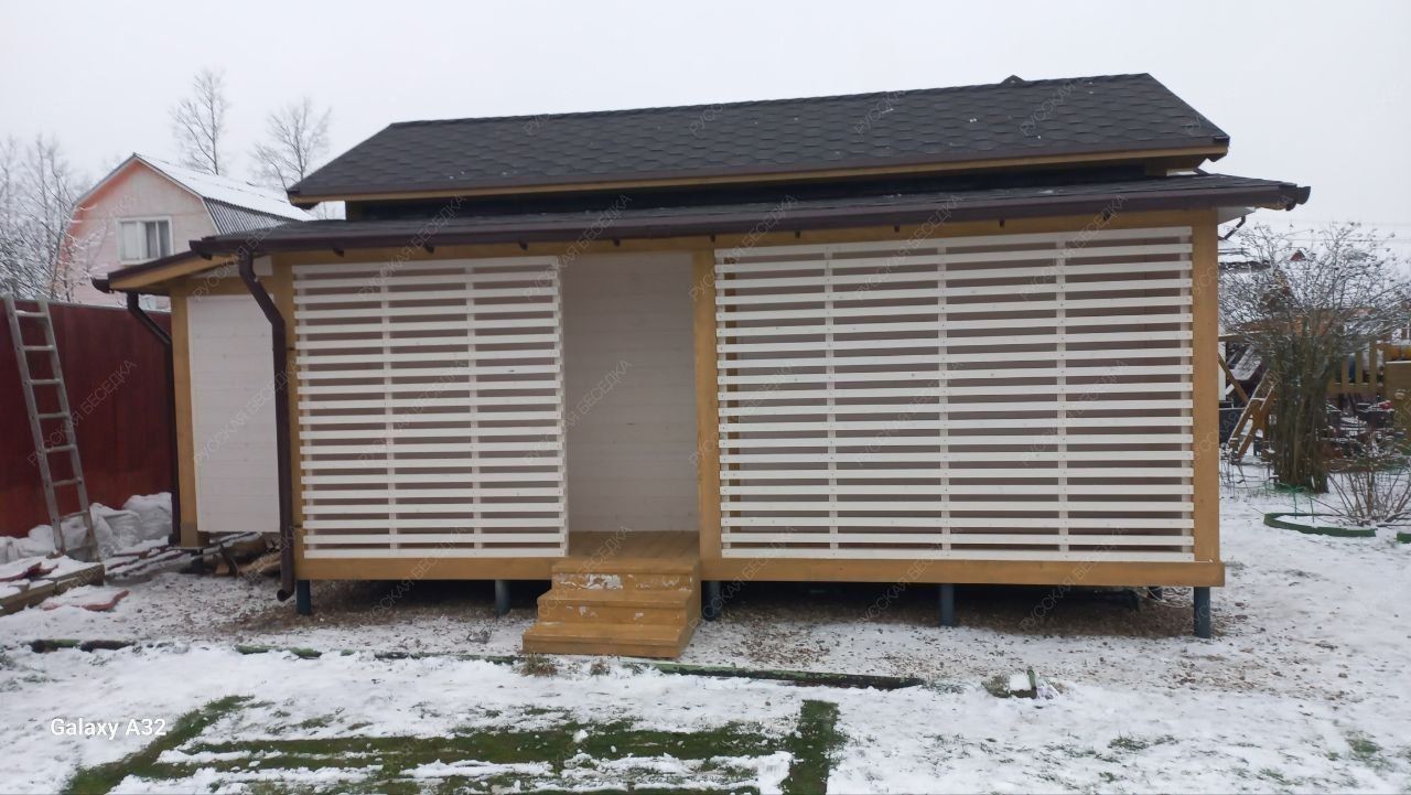 Имитация бруса 16×135 мм внутри, имитация бруса 21×135 мм снаружи.