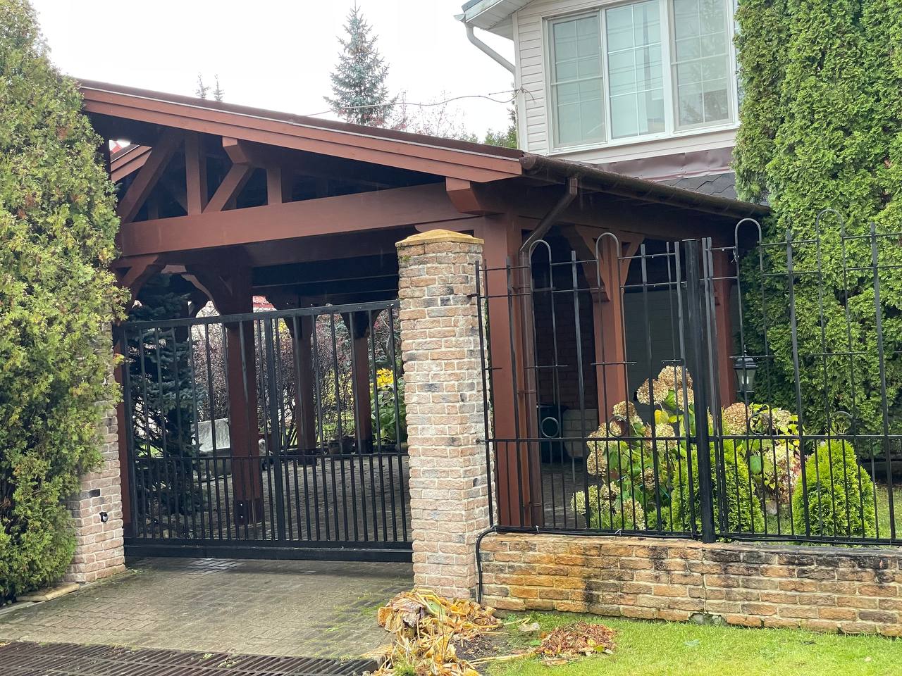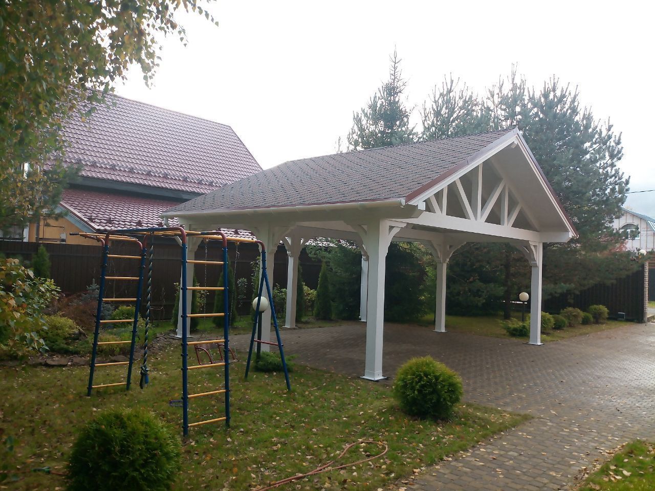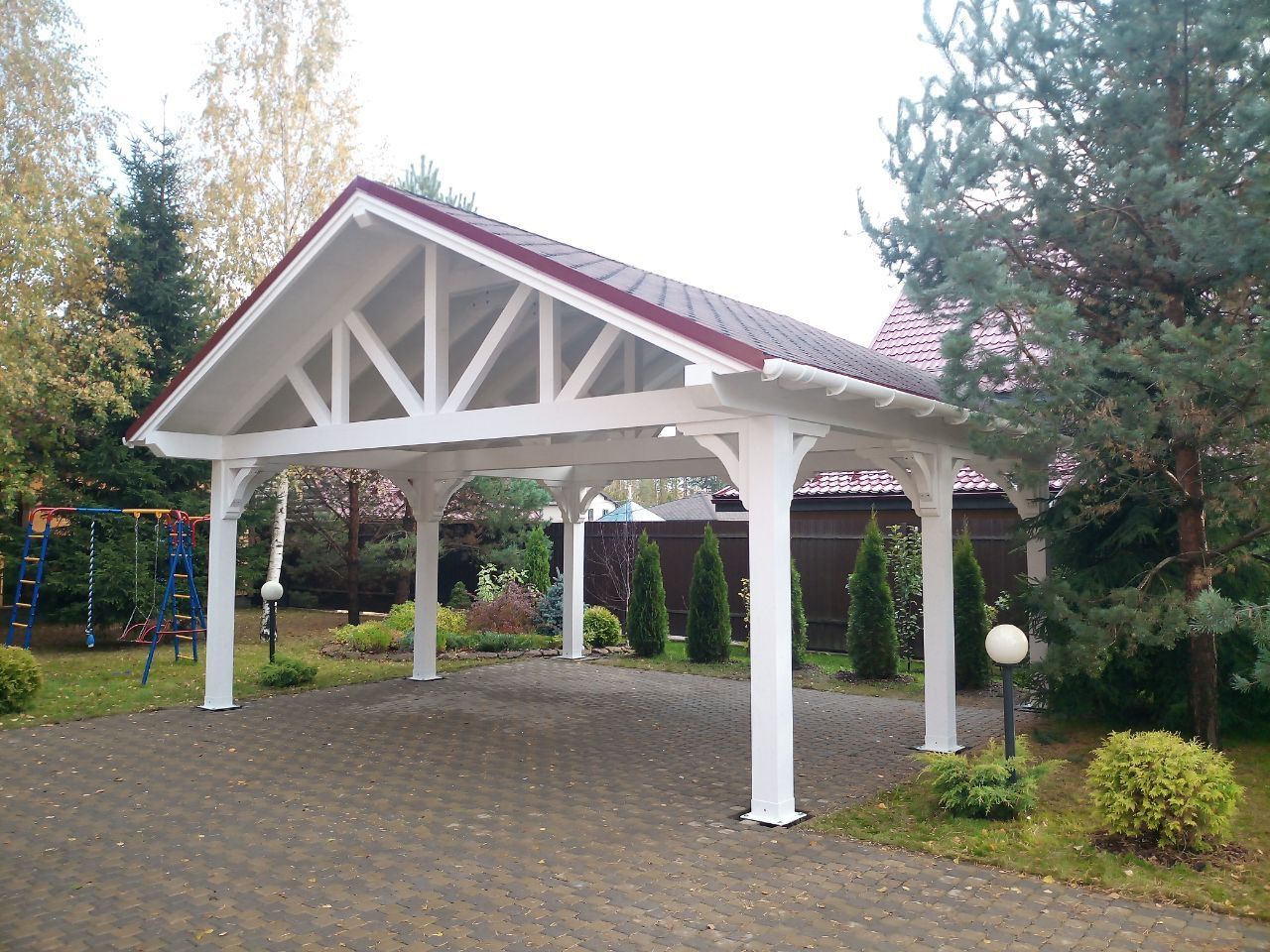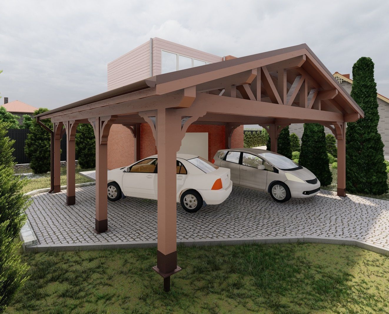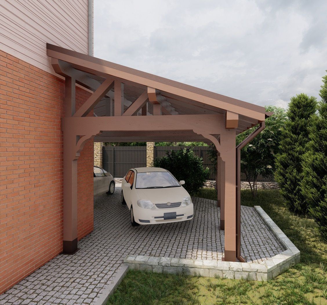Навес из дерева послужит отличным парковочным местом для одного или нескольких автомобилей.