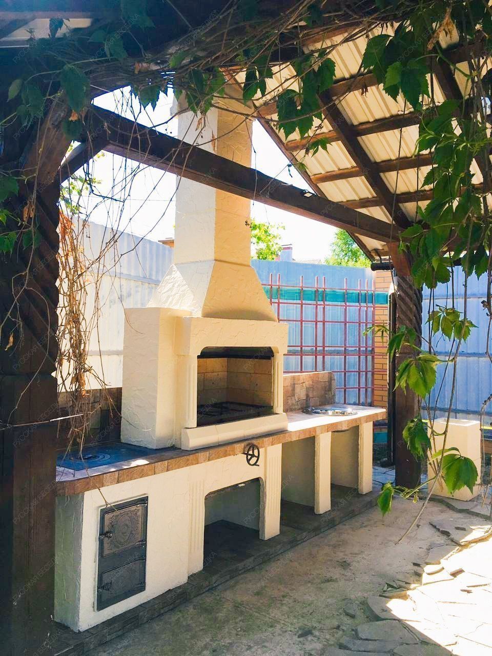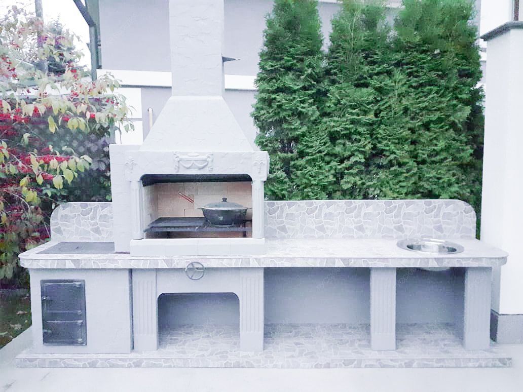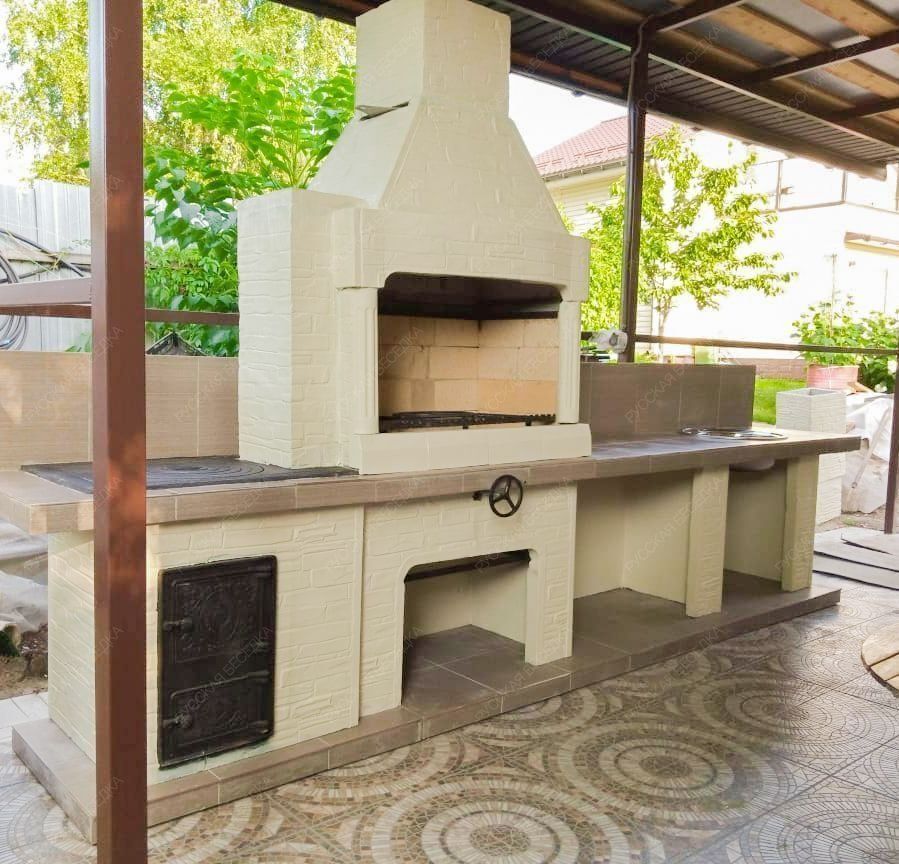 Печь-барбекю этой модели представляет собой полноценную кухню — вам остается только провести воду для использования встроенной раковины. У конструкции есть открытая топка и плита, работающая от закрытого огня, так что вы можете готовить почти все блюда. Исключением станут только те рецепты, для реализации которых нужна полноценная духовка. В остальном изделие ничем вас не ограничивает.