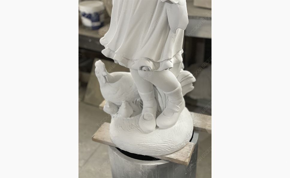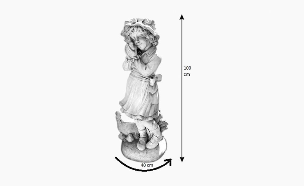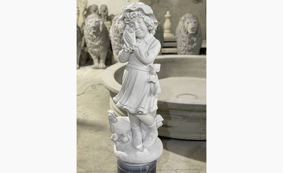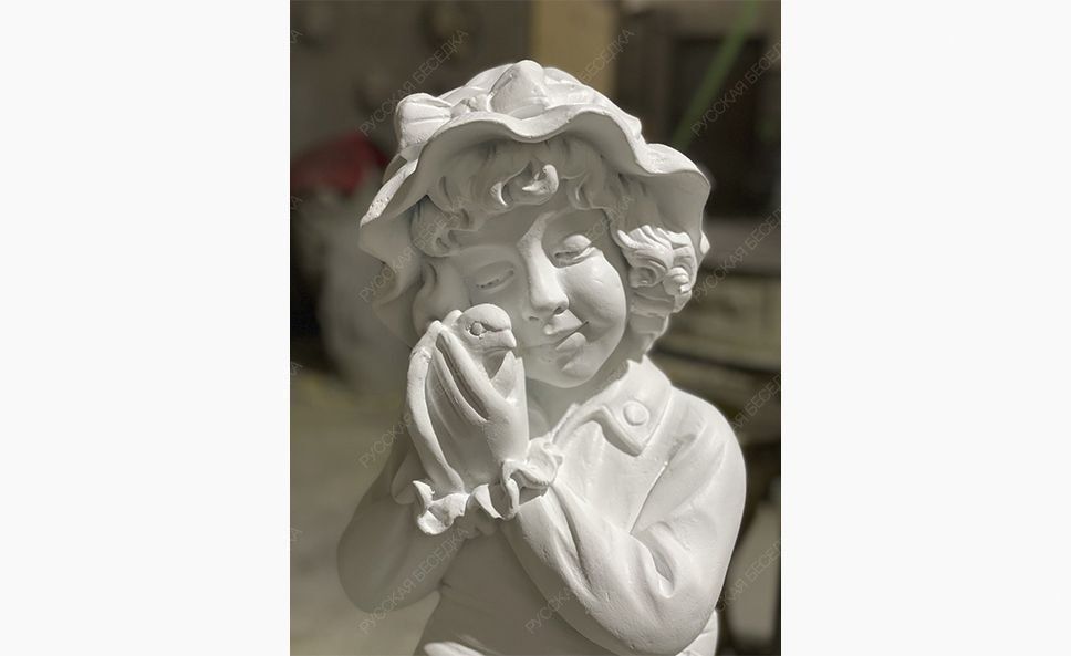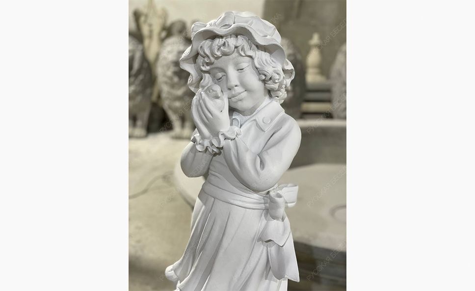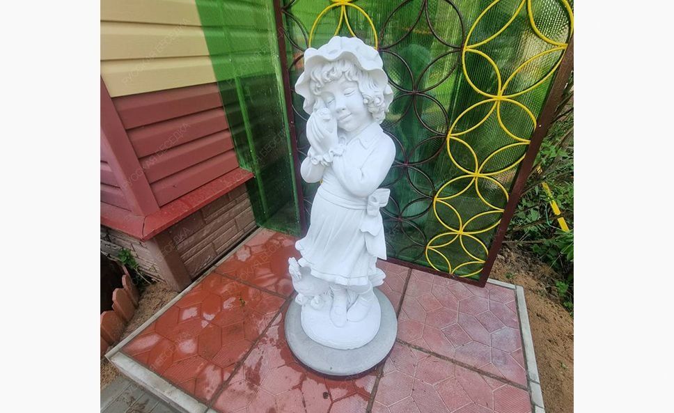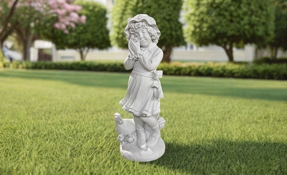Статуя девочки с птенцом выполнена из надёжного архитектурного бетона. Она устойчива как к дождю, так и к жаре и холоду. Именно поэтому её можно использовать на улице круглогодично. Само изделие может быть покрашено в любой цвет на выбор: золото, бронза, античная бронза и др.                                                                                                                                                                                   Милая девочка держит птенца у своего личика, нежно прижимаясь к нему. У её ног играют ещё несколько птенчиков. Эта садовая статуя несёт в себе столько нежности и гармонии! Отличный подарок для мамы или бабушки. Скульптуру девочки с птенцом можно установить в саду, на даче и даже в самом доме. Эта статуэтка придаст вашему интерьеру искренности и доброты.