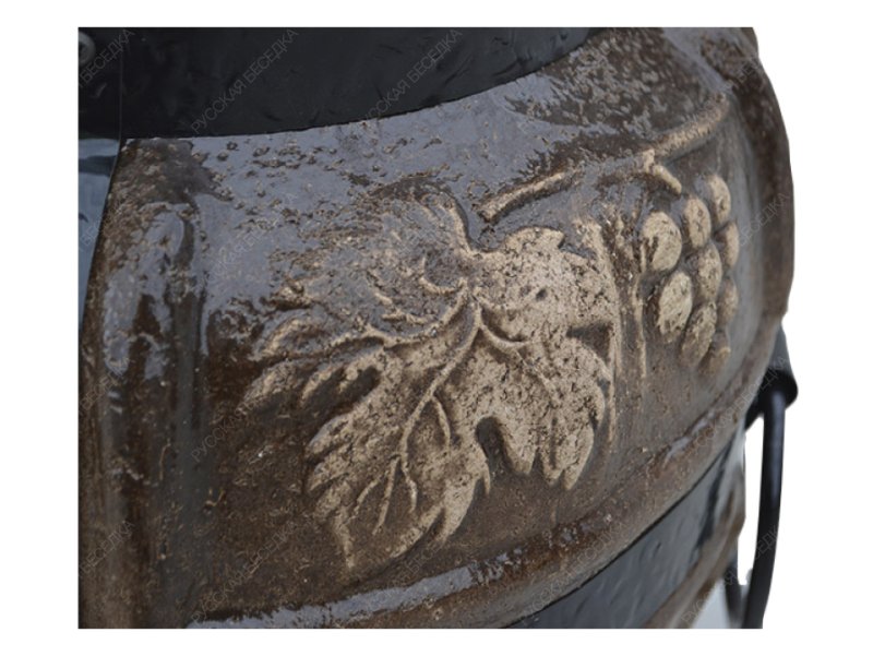 "Барельеф" не только удобная и функциональная керамическая печь, его внешнему виду уделено много внимания. Поверхность украшена рельефными орнаментами и элементами из металла. Такой тандыр станет прекрасным украшением для вашего загородного участка.